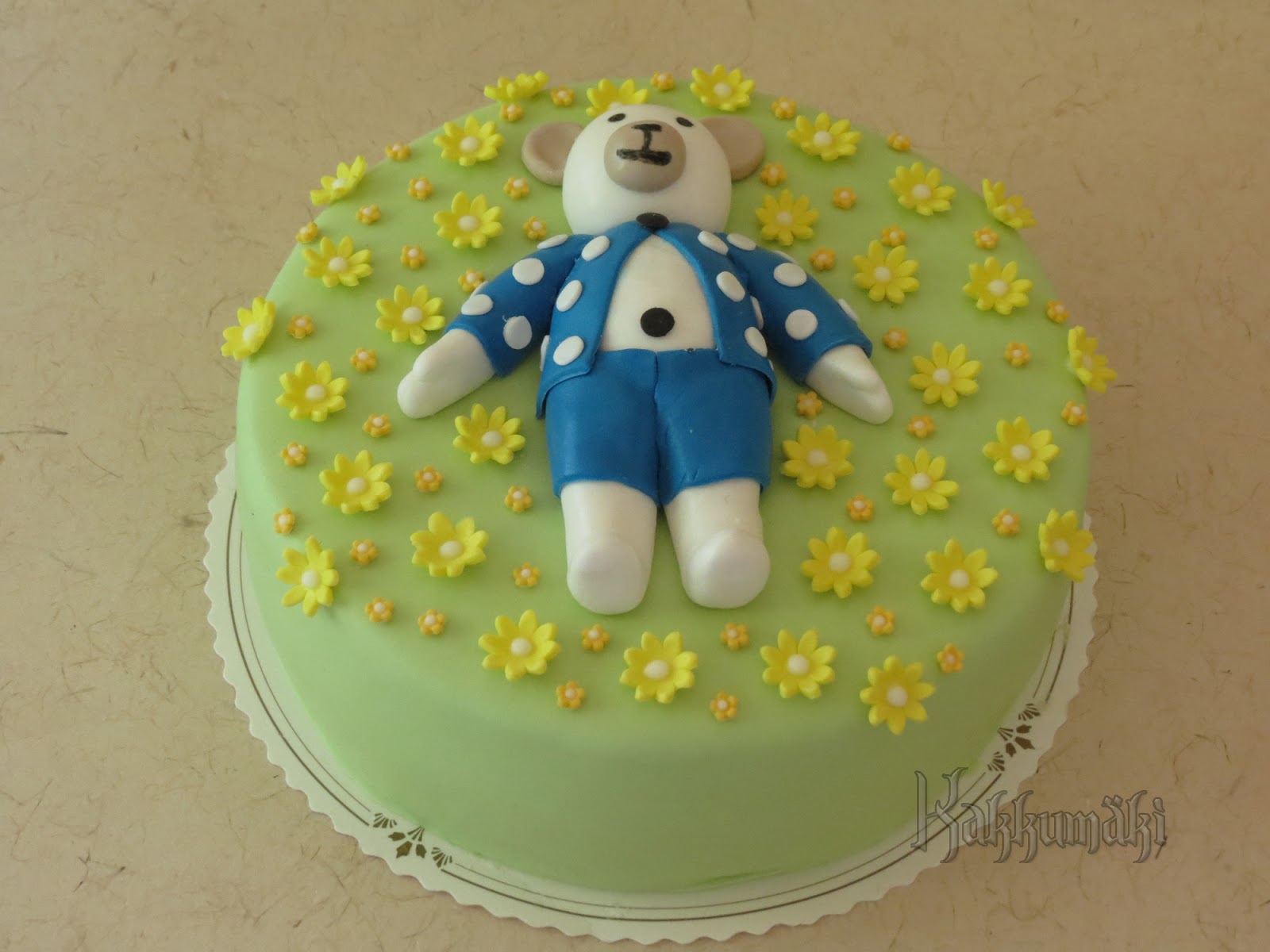 Aiheen kuultuani oli minulla heti visio kakusta, jossa nalle makaisi kesäisellä kukkaniityllä nauttien auringosta ja kukista. Kukkien värin valinta oli yllättävän vaikeaa. Lopulta päädyin keltaiseen, ettei aina tulisi tehtyä vaaleanpunaisia kukkia tytöille. :)