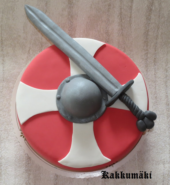 Viikinkiharrastajaystävä täytti pyöreitä vuosia ja pyysi minua tekemään kakun. Toiveena oli samanlainen kilpi kuin olen aiemmin tehnyt miehelleni isänpäiväksi. Kilven päälle hän toivoi kirvestä tai miekkaa lappeelleen.